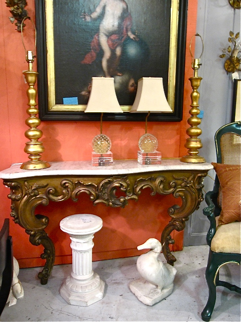 As you can see, Roberto had a few free hours (he never has free hours) on Friday (Miracle No. 1). But before he arrived, I went into a minor panic because Dennis (super mover) had not delivered my items from the Auction house....what would Roberto do without the shipment?? After a quick call to Dennis, who promised to bring the items before 3pm (Roberto had to leave by 4); Roberto and I set about destroying and rearranging the shop...I usually give Roberto the basic structure of what needs to be done and he figures out the rest without my having to micro-manage. The above photos show the first stages of getting ready for the new items--hard to believe that anything else could possibly fit into this space!! (No, I'm not sharing Roberto or giving out his number.)